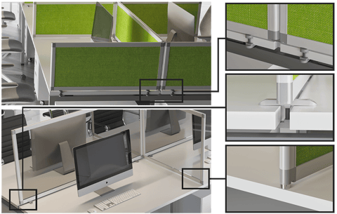 REYEM office screens can be mounted onto desktops from 10mm to 38mm thick using clips.