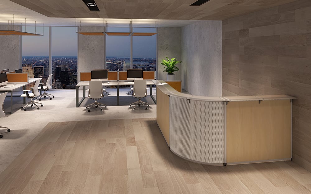 Reyem welcome desk panels can be adapted to suit your offices thanks to the range of finishes on offer: melamine, fabric, opal glass-style acrylic or perforated sheet steel.