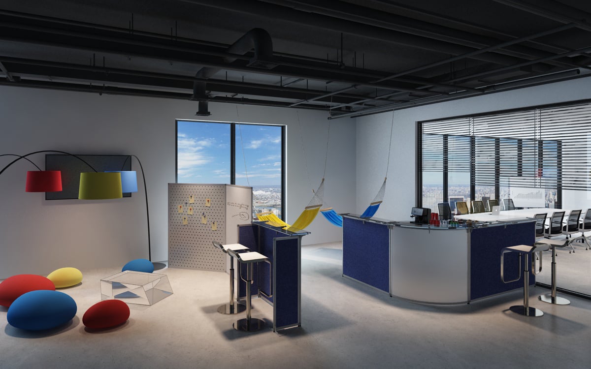 Les panneaux pour banques d'accueil Reyem s'adaptent à vos bureaux avec des matériaux de finition variés : Mélaminé, tissu, verre acrylique opale ou tôle perforée acier laqué RAL 9006.